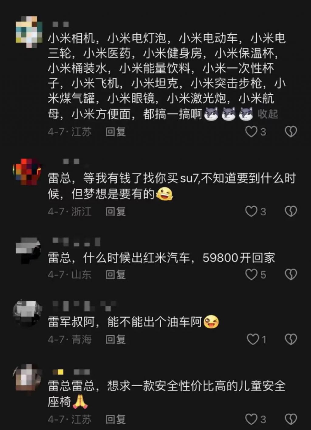 " 雷总,什么时候出红米汽车,59800 开回家。"
