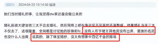 而提到窦骁与何超莲的豪华婚礼,也有网友认为噱头大于实际,称当时网络热度高看起来隆重,实际上除了珠宝婚纱并没有太重量级的嘉宾,尤其是澳门名流及赌王大家庭成员的缺席,没有百亿千金的排场。
