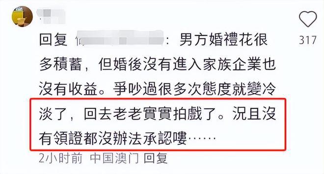 这位澳门 IP 的网友还爆料称男方婚礼花了很多积蓄,但是婚后并没有进入何家家族企业,也没有获得任何收益。双方争吵多次后态度就变冷淡了,继续回到娱乐圈老实拍戏。而由于何超莲与窦骁并没有领证,法律上也无法承认婚姻关系,简单来说就是倘若两人分开,窦骁分不到女方家的财产。