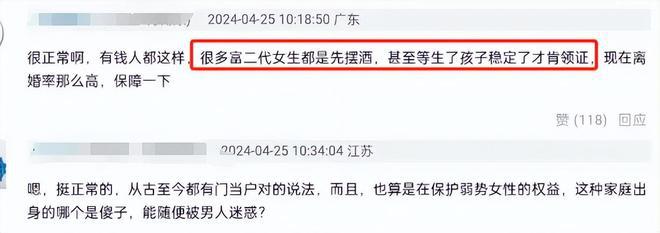 有网友看后惊讶双方态度转变之快,毕竟离办婚礼才刚过一年。但也有网友并不意外这个结局,认为有钱人的家庭就是这套操作,古往今来都推崇门当户对,像何超莲这种出身,通常都是先办酒席生孩子,之后再领证,毕竟离婚率高,能有限制地保护女生权益。