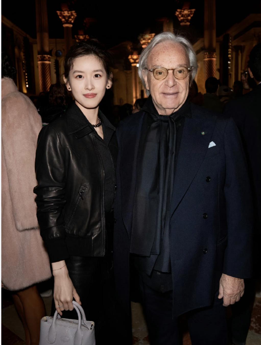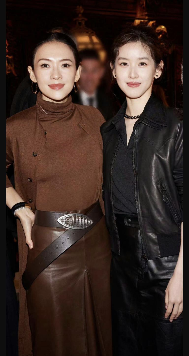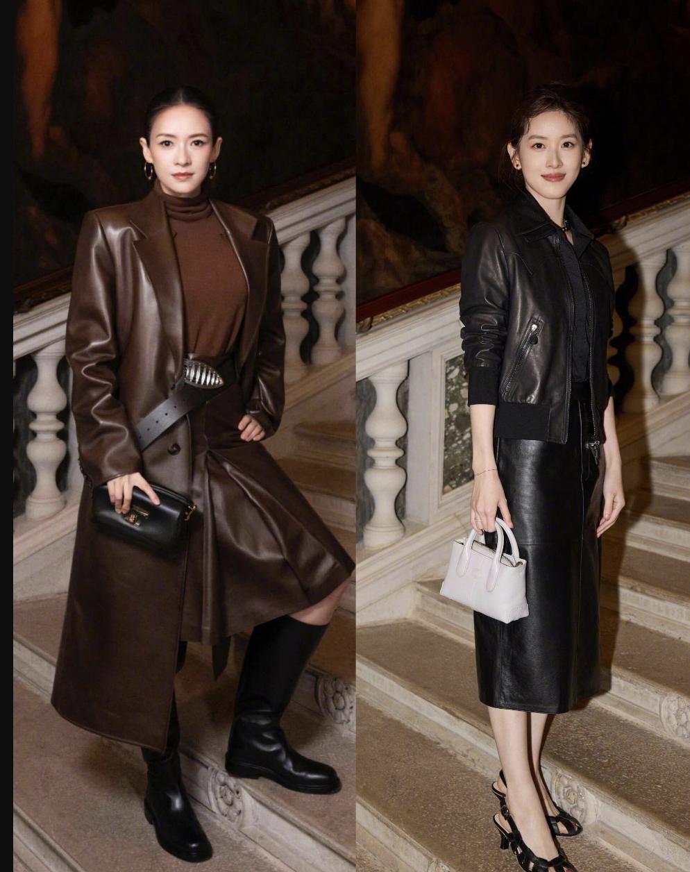章子怡的棕色皮衣,很大气高贵,奶茶妹妹的黑色套装更为纤细干练。