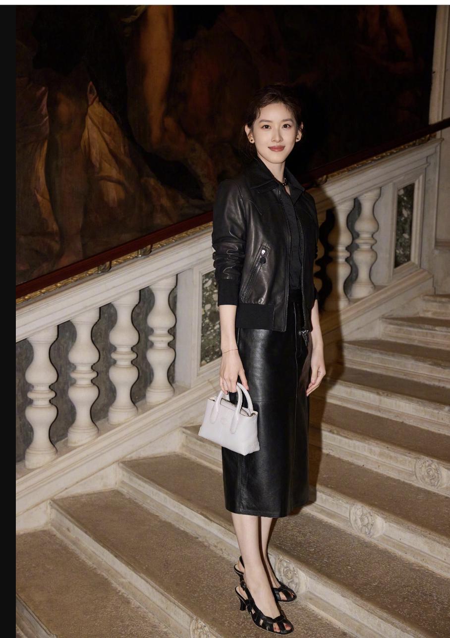 章泽天一身黑色的皮衣,皮裙,还挽着长发。