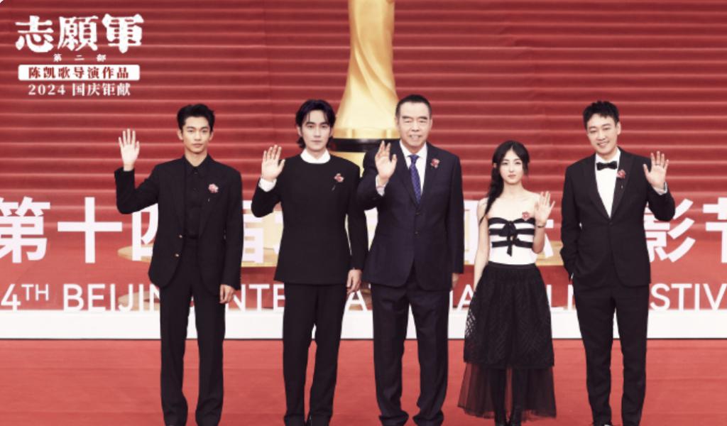 陈凯歌还和张子枫等志愿军的演员们握手,并且和和陈红一起,和胡歌聊了好长一会。