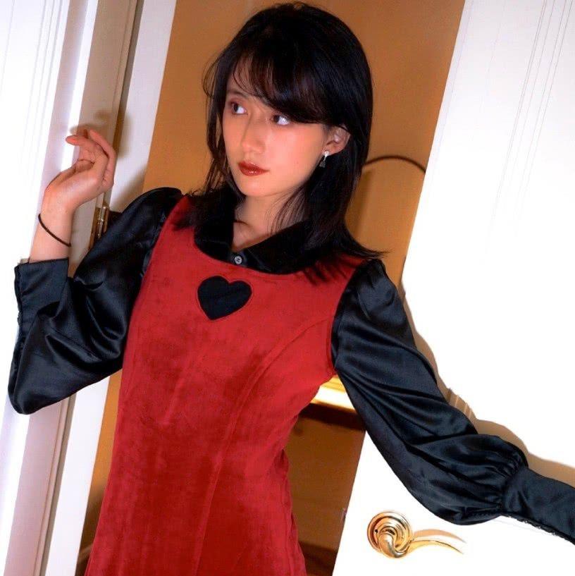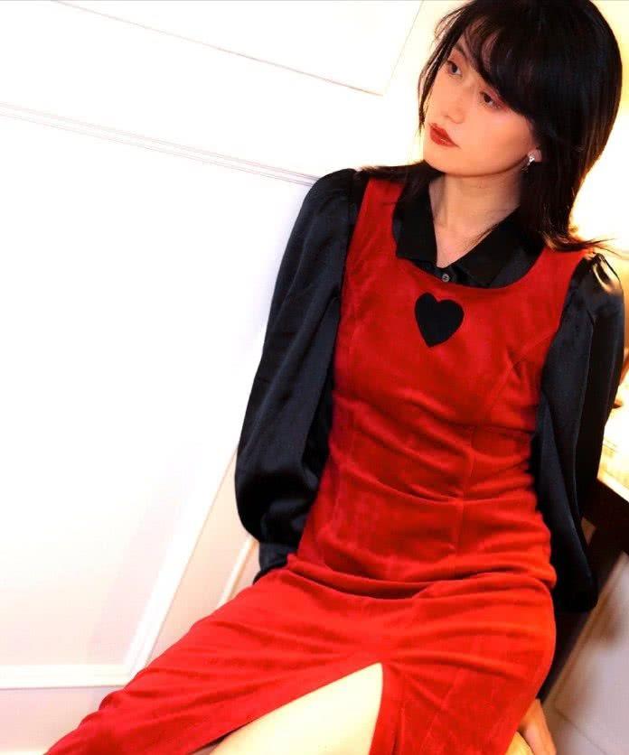 照片中的黑尾酱身穿一个红色的连衣裙,内搭一个黑色的绸缎衬衣。这件连衣裙最大的特色就是它有一个红心,不过看起来很想是一个围裙,而且因为这个裙子是紧身的,一下子暴露了黑尾酱的真实身材。
