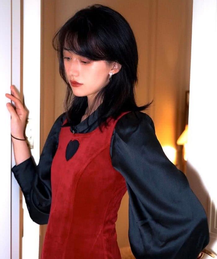从图片中可以看得到,黑尾酱化着浓厚的妆容修饰脸部轮廓,她的脸型是瓜子脸,浓眉红唇,一头优雅的短卷发,增添不少俏皮感,她身穿红色长裙拍照,意外暴露“钢管腿”。