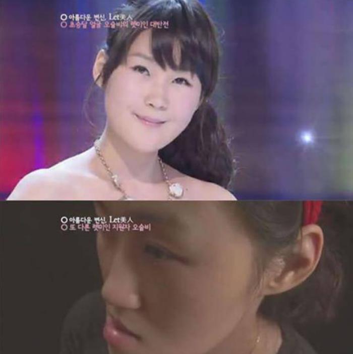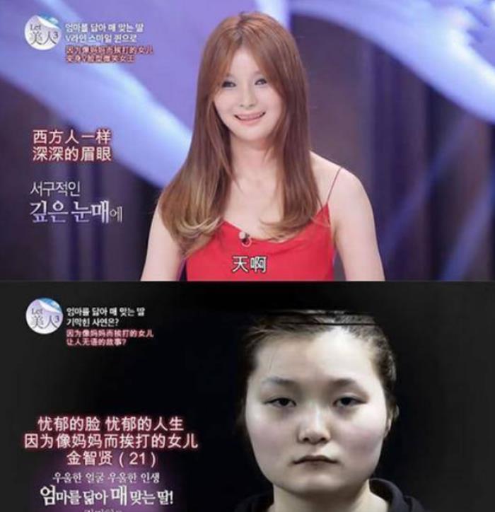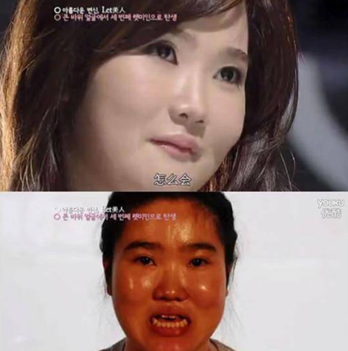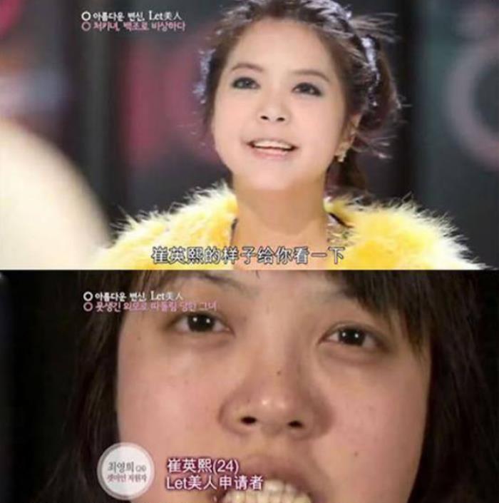 图中这位韩国女子因为又胖又丑被备受男孩子欺负,通过10多次的整容手术后,从一个大盘脸变成了V字脸,整容前后判若两人。