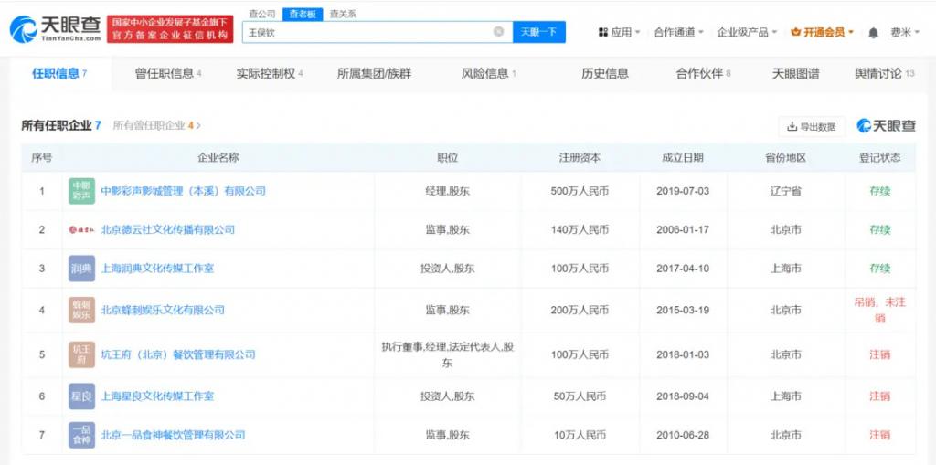 据悉,此前曾有媒体报道王俣钦因涉嫌强奸入狱。公开资料显示,王俣钦是郭德纲妻子王惠的表弟及岳云鹏经纪人。天眼查显示,目前,王俣钦名下有 7 家企业,其中 3 家为存续状态,包括其持股 1% 并任监事的北京德云社文化传播有限公司。