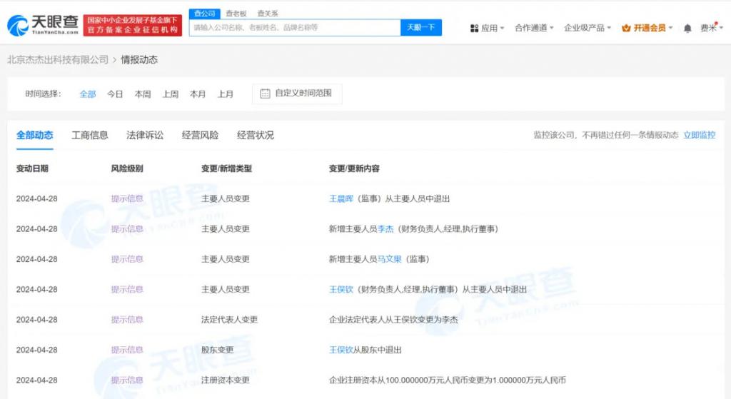 近日,据天眼查 App 显示,北京杰杰出科技有限公司发生工商变更,王俣钦退出股东行列并卸任法定代表人、执行董事、经理、财务负责人。同时,该公司注册资本由 100 万人民币减至 1 万人民币。