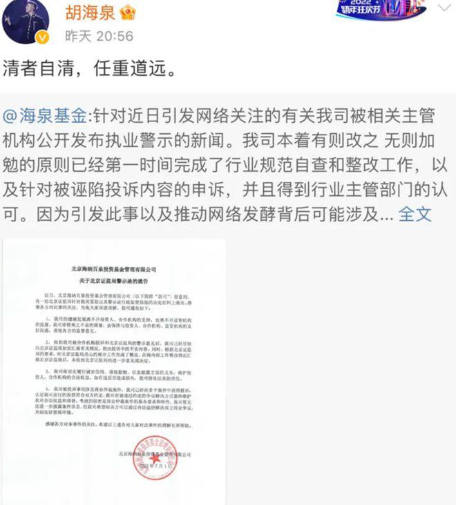 对此,海纳百泉基金官方微博 " 海泉基金 " 迅速发布声明,称第一时间完成了行业规范自查和整改工作。胡海泉也在 7 月 1 日转发该声明,并配上了 8 个字:" 清者自清,任重道远 ",主打一个态度恳切。