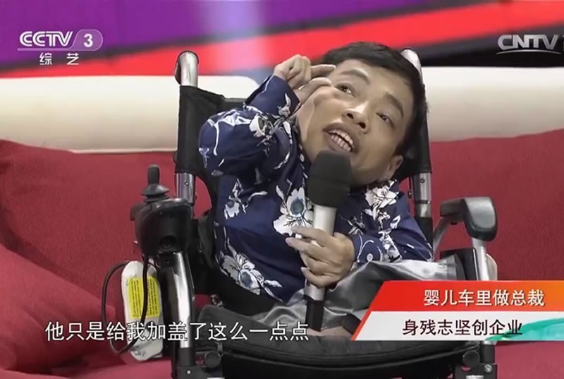 现场中,他坐在轮椅上,不能走路,长着一副大人脸,身材却很小,身高只有约90cm。