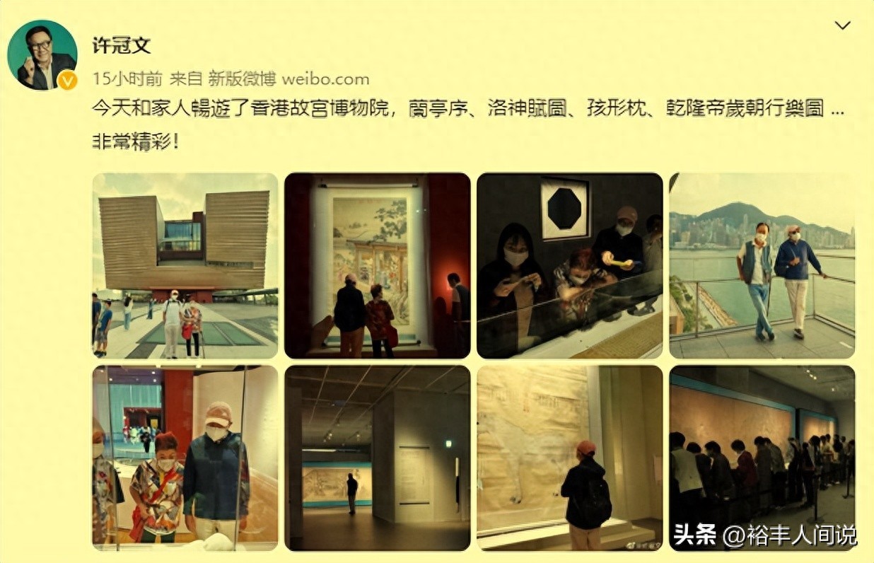 9月5号,知名喜剧人许冠文罕有于社交网上分享了一组外出游玩的画面,并留言说道:今天和家人畅游了香港故宫博物院,兰亭序,洛神赋图、孩形枕、乾隆帝岁朝行乐图,非常精彩。