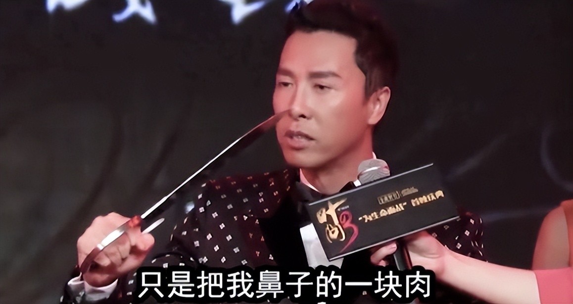 而甄子丹虽有一身好功夫,但还是稍稍不敌砍疯了的张晋,所以最后硬生生被对方削掉了鼻子上一小块肉。