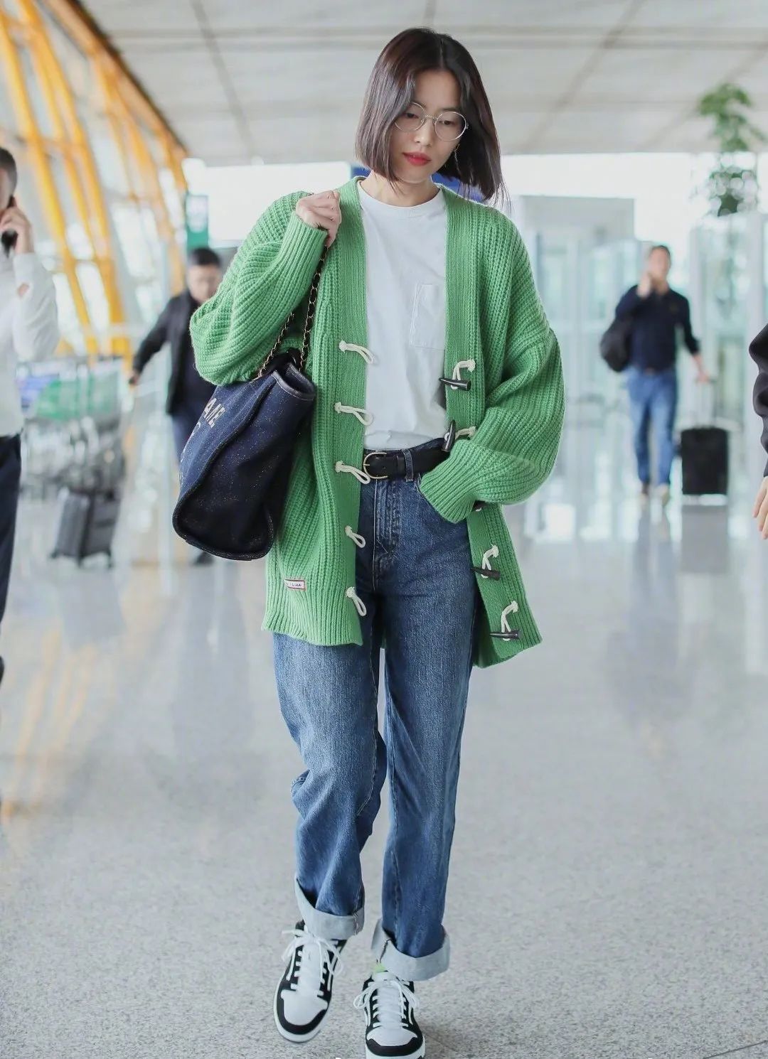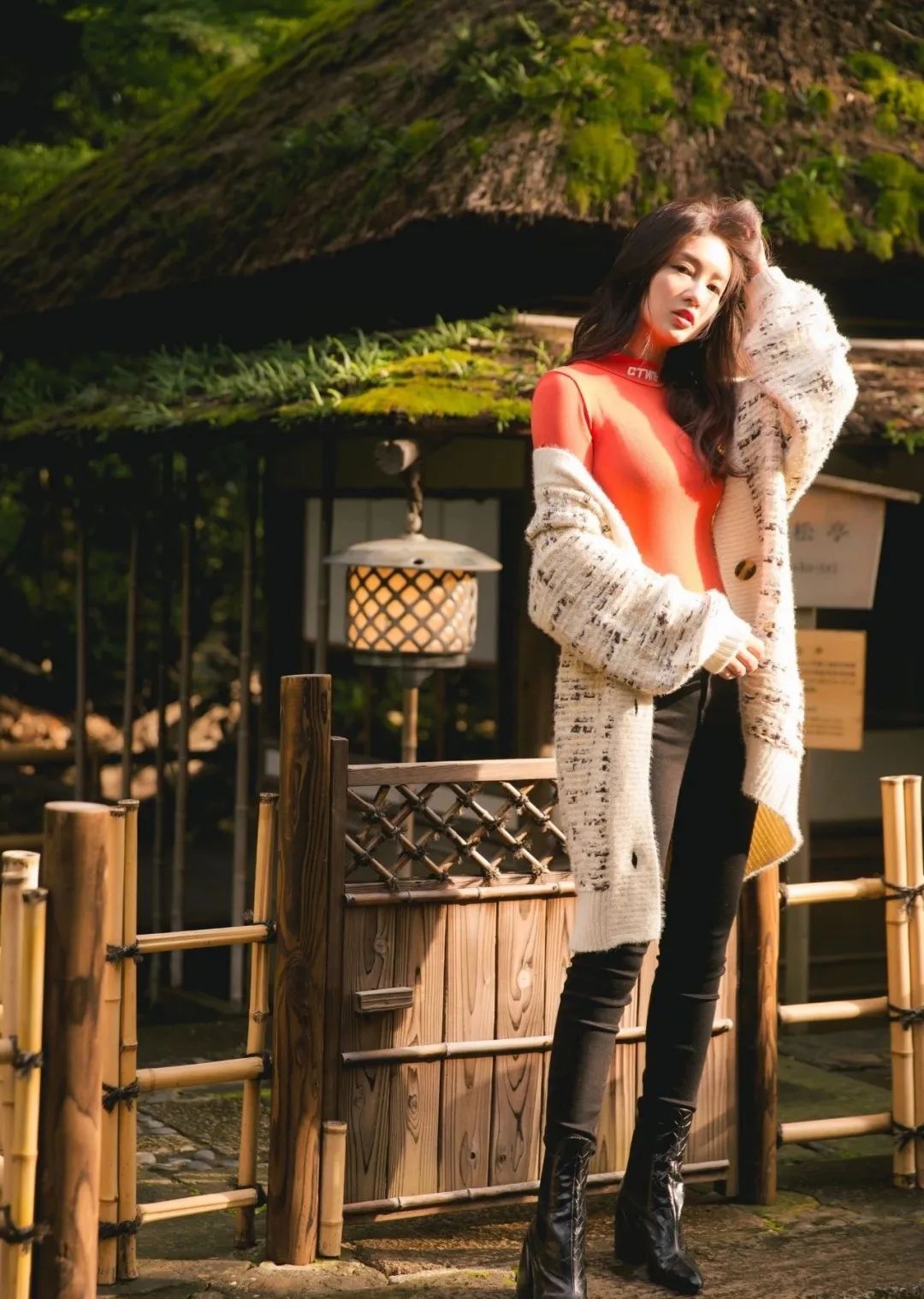 大廓型的针织开衫就容易显得臃肿,内搭的高领衫最好像江疏影一样选择深色,否则就太“胖”了。