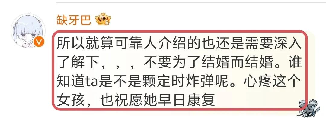 “所以就算可靠人介绍的也还是需要深入了解下……不要为了结婚而结婚,谁知道ta是不是颗定时炸弹呢?心疼这个女孩,也祝愿她早日康复”