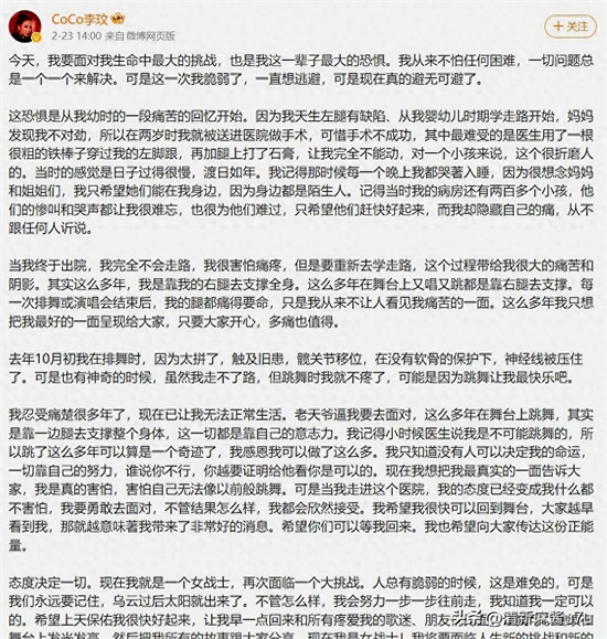 今年2月23日,李玟本人也曾在社交媒体上分享了自己的心路历程。她提到自己天生左腿有缺陷,而童年时被迫接受手术治疗。这段经历不仅带来了身体上的痛苦,还给她的心灵留下了创伤。但李玟展现了惊人的坚韧,重新学会走路,顽强地靠右腿支撑自己的整个身体,为了追逐音乐梦想,为了让观众看到最好的一面。