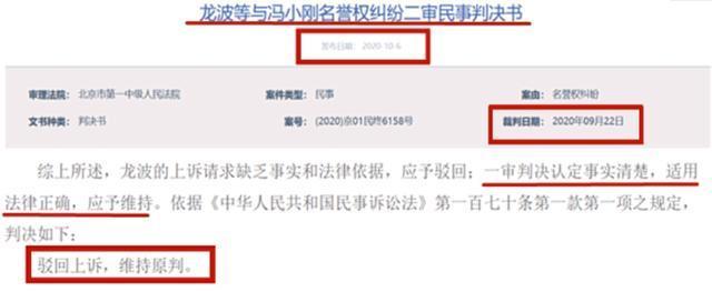 判决下达以后,龙波方面不服提出上诉。近日,备受关注的二审结果终于公布,不出意料,结果就是维持了一审判决。龙波向冯小刚公开道歉,消除影响,并赔偿冯精神抚慰金8万元。