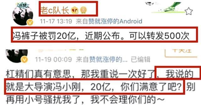 然而这位叫龙波的大V很快就被当事人打脸了,他曾信誓旦旦表示,冯小刚偷税漏税被罚20个亿,这个消息马上就会公布,同时表示该条消息允许网友转发500次。(超过500次涉及追责问题)