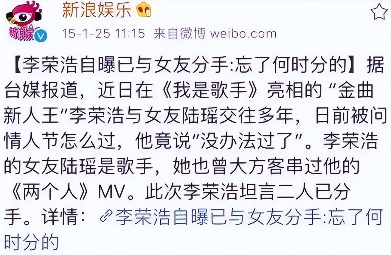 2015年1月《歌手》在播期间,李荣浩承认与女友陆瑶分手。