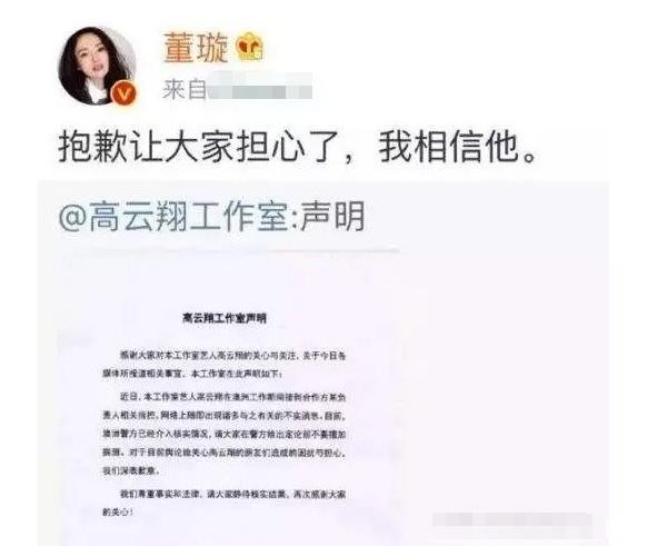 事发之后,妻子董璇并未多做表态,仅说“我相信他”,便匆匆飞往澳洲,尽最大的努力保释高云翔。