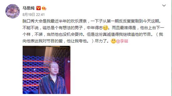 8月19日,综艺《脱口秀大会》更新,马思纯在节目播出后发文夸赞李诞,她写道:“《脱口秀大会》是我最近半年的欢乐源泉,一下子从第一期反反复复刷到今天这期。不能不说,诞总是个有想法的男子,中年得志。而且最难得是,他台上台下一个样,不装,当然他也没机会耍帅。但是这份真诚值得我继续追他的节目。(我向他表达我对节目的爱,他让我夸他。)尽力了。”李诞见状在评论区回应称:“括号之外的都是真情实感,很感动,有品味,替你开心。 ”