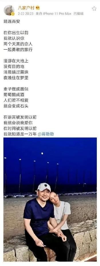 陈建斌会写诗,曾在结婚纪念日给蒋勤勤写了一首情诗,蒋勤勤转发说她就是这么沦陷的。