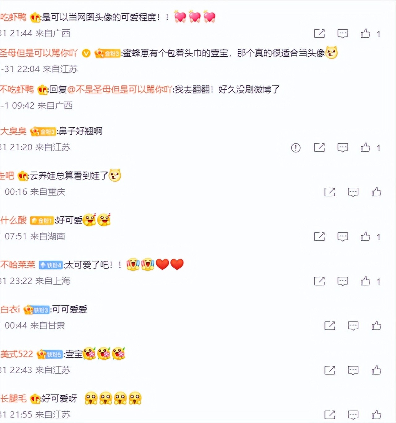 看到韦壹的新照片,“云养崽”的爸爸妈妈直呼可爱,夸奖韦壹照片是可以当头像的程度,还感慨他们“云养娃”这么久,终于可以看到娃的脸了,这么可爱难怪韦神、蜜蜂仔藏得深。