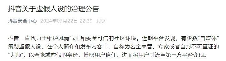 7月22日,抖音安全中心发布《关于虚假人设的治理公告》(下称治理公告),对平台内“自媒体”策划虚假人设,以夸张或虚假的身份,博取用户信任,进而将用户引流至第三方平台变现的行为进行专项调查。如若被发现违规,抖音将采取包含下架视频、取消营利权限、禁止关注、封禁账号等在内的措施进行治理。