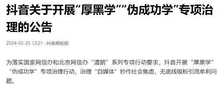 3月份时,抖音官方发布《关于开展“厚黑学”“伪成功学”专项治理的公告》,表示将专项治理“自媒体”炒作社会焦虑,无底线吸粉引流牟利问题。对一些“自媒体”利用人们担忧落后的心理,制造社会焦虑并推销“解药”,通过矩阵号将用户引流至第三方进行卖课、入群等变现的行为进行打击遏制。