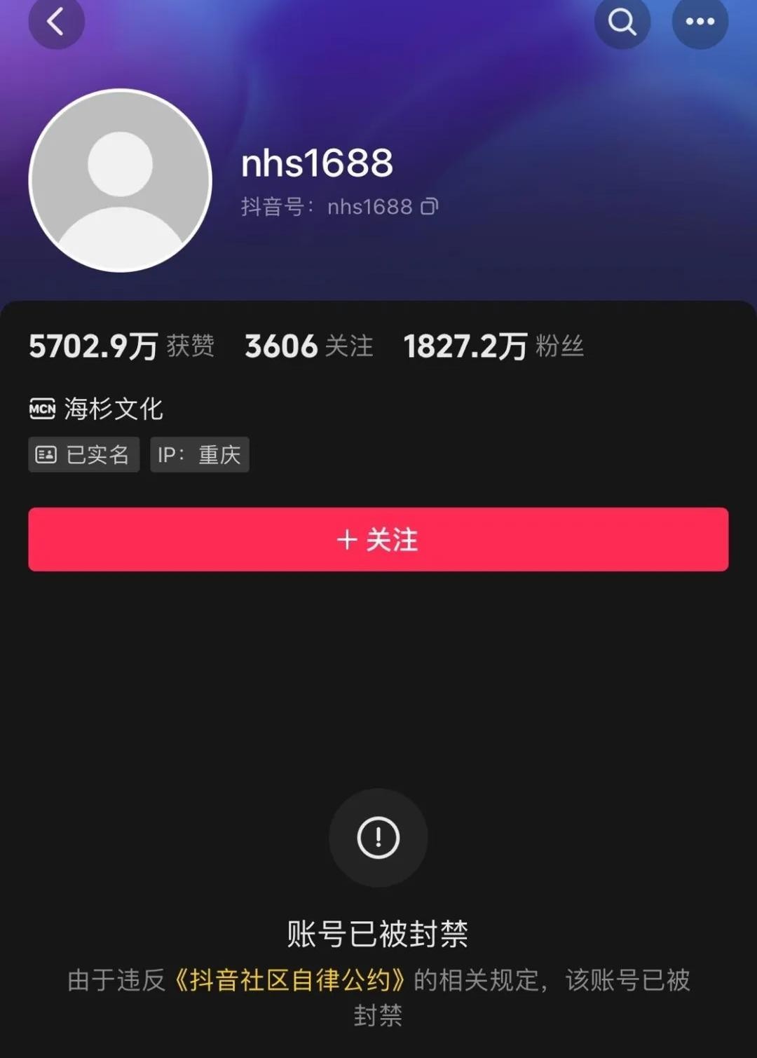 大号小号无一幸免 倪海杉被封原因引猜测 8月5日,倪海杉拥有1827万的抖音账号主页显示,“由于违反《抖音社区自律公约》的相关规定,该账号已被封禁。”