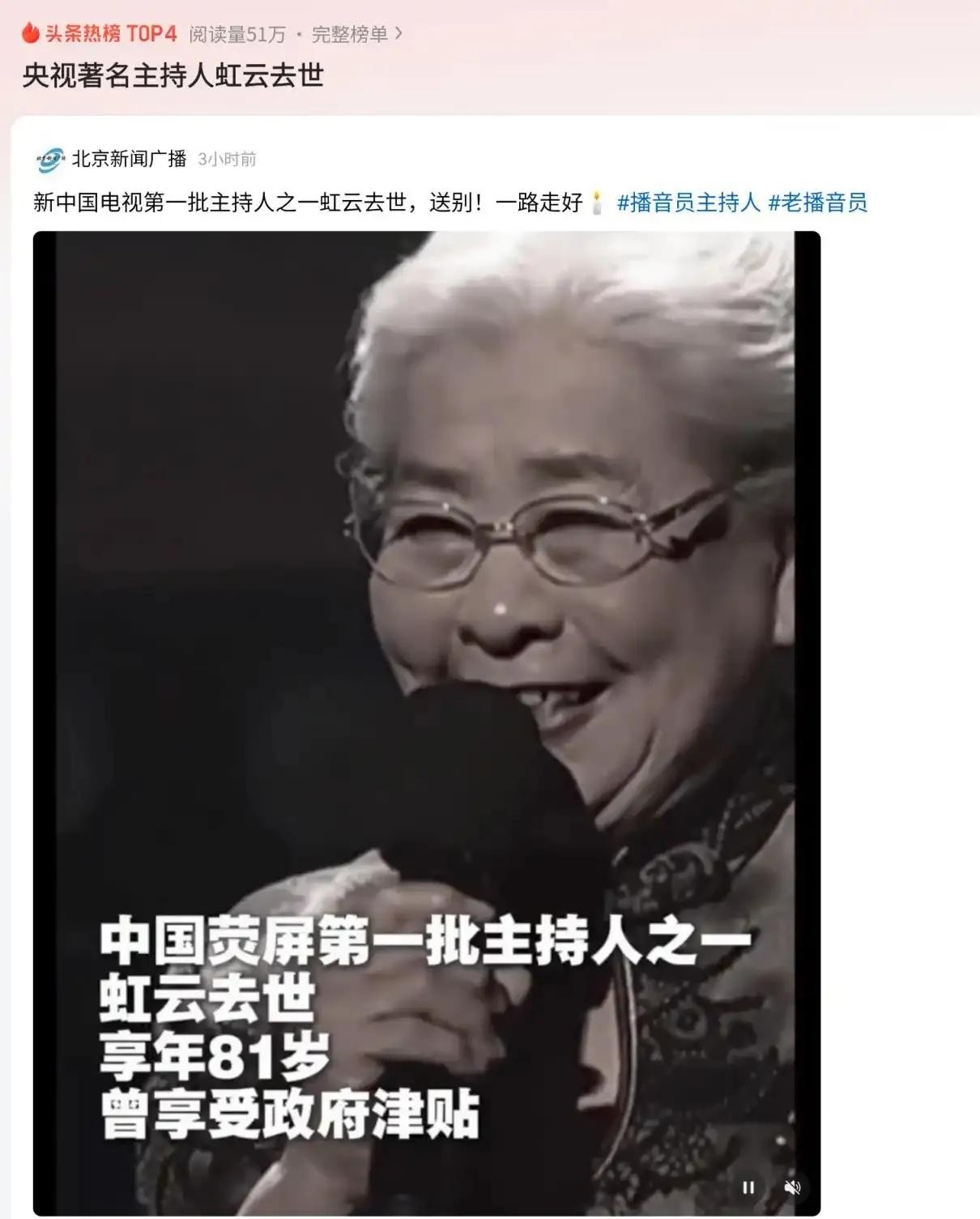 2025年大年初二那天,虹云感觉身体不舒服,就只能自己一个人去医院看病。想想真的挺心酸的,这么一位为播音事业奉献了大半辈子的老艺术家,生病了都没有个人陪着去医院。从大年初二一直到2月13日,这段时间里她的病情越来越严重。到了2月13日,虹云因为病情恶化,在北京去世了。她的离开,让好多喜欢她的听众和观众都特别难过、特别伤心,大家都在心里头怀念她那好听的声音,怀念她给大家带来的那些美好的回忆和时光。