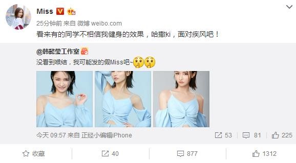 Miss本人转发了微博,并配文:看来有的同学不相信我健身的效果,哈撒ki,面对疾风吧!