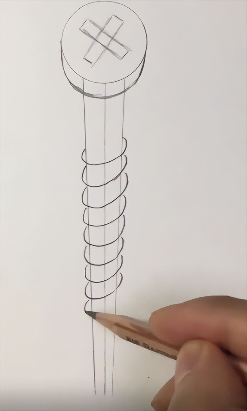 就连一个小小的螺丝钉,都能被他画得跟刚从零件上,拆下来的一样。先画一个圆,又拿尺子画了几笔直线,而他全程的材料仅仅是一只铅笔,完全不用配色。