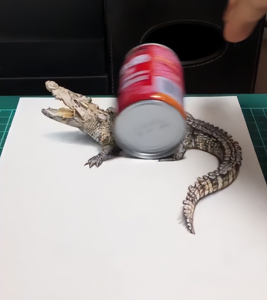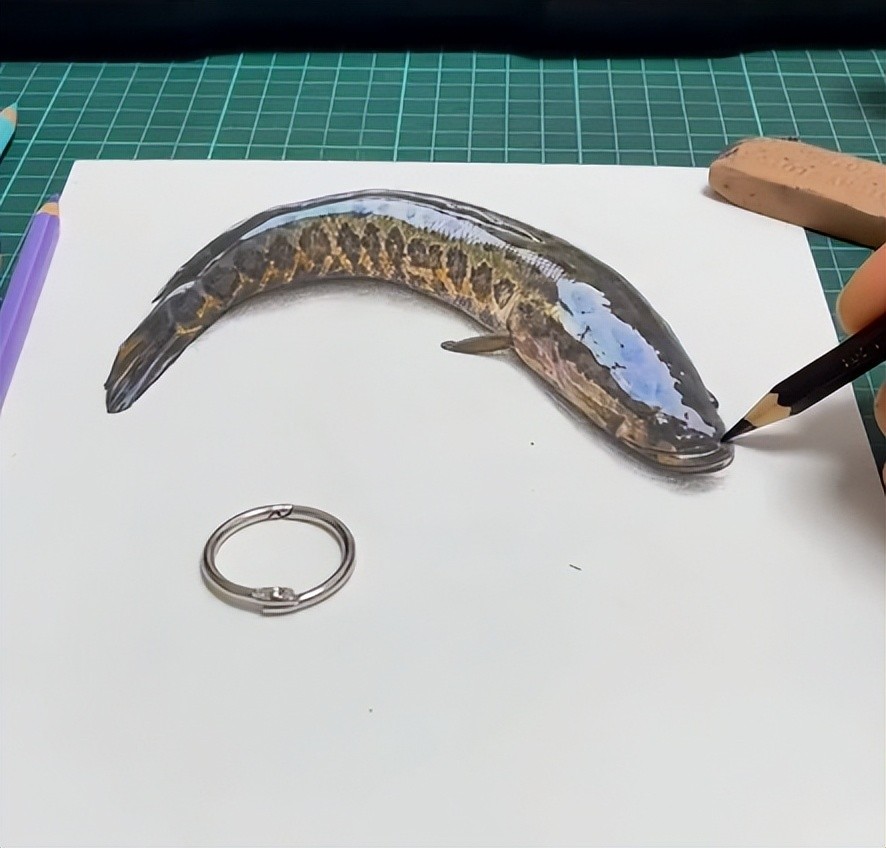 长蛇缠绕在铅笔上,他的3D画逼真到,甚至得拿把刀子在蛇的面前挥过来挥过去,才能分辨出真假。