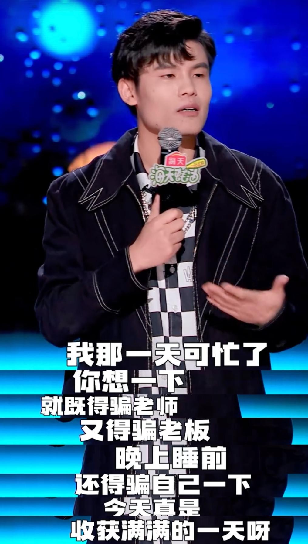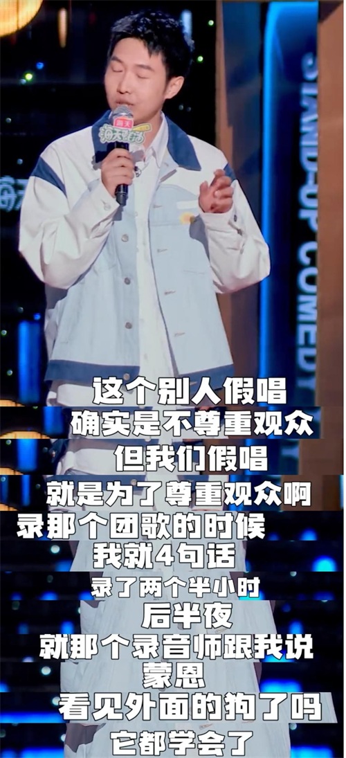 蒙恩上场是很有自信的,是非常确定那个梗会逗笑大家,每次都在笑点的那句话上特别用力。除了调侃别人,嘲讽自己也够狠,说学团歌时,狗都学会了,他还没学会……