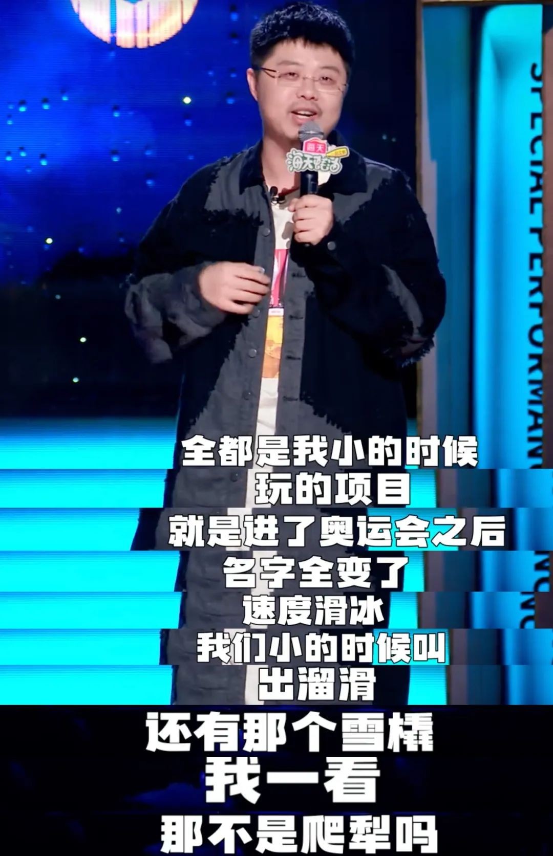 体育专场少不了调侃男足,但说太多,就显得贫了,也得说点别的。作为东北人,把冬奥会项目和自己小时候玩的体育项目结合起来也是很好的一个切入点,让北方观众特别是东北观众产生强烈的共鸣,即使你不是东北人,没体验过那些运动,你也能get到他说的那个点。