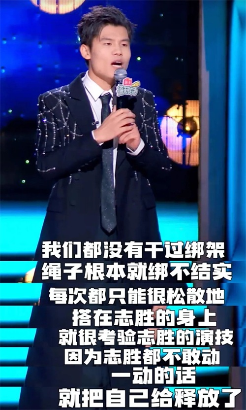 这个段子里,要结合上半场他们拍摄短片的过程才会产生共鸣。比如志胜被绑架,广智说他们不会系那个绳子,导致志胜动作不能太大,否则就把自己给释放了。