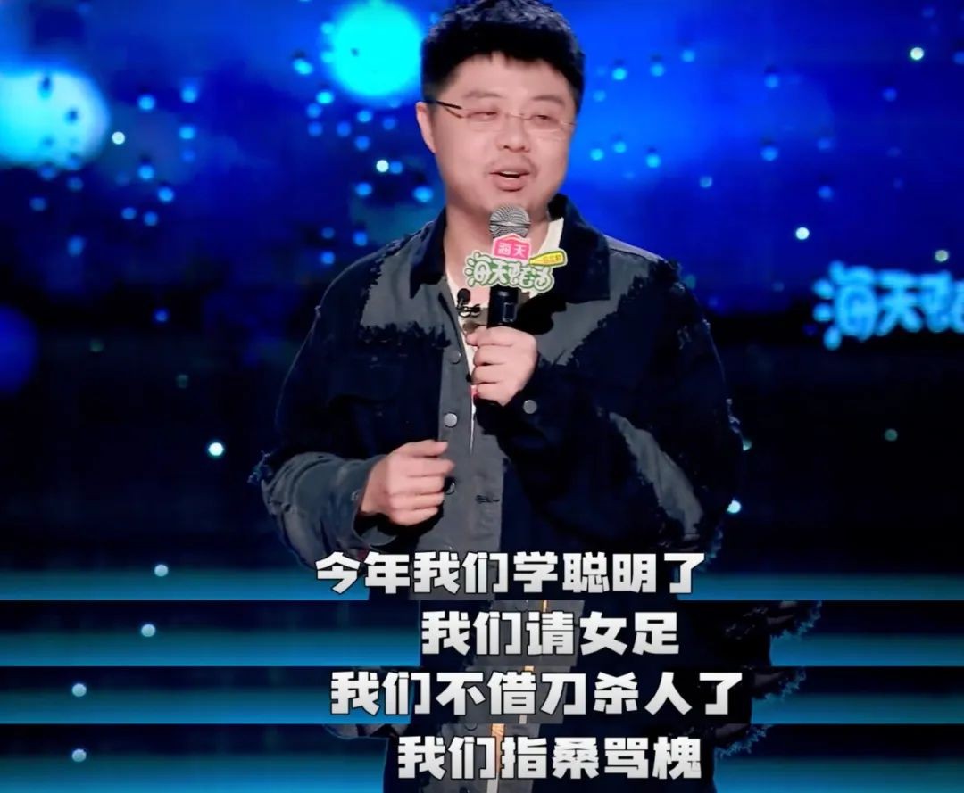 接下来的体育专场怎么能少了老将呼兰呢?开场就很有煽动的气势,毕竟笑果文化之前在吐槽大会让男足和男篮互相PK已经给很多人留下深刻印象。于是这回不找男足,找女足,呼兰称之为“指桑骂槐”,把女足比作桑树,把男足和男篮比作槐树,还把鲁迅的经典句式用在这里,包袱很响。