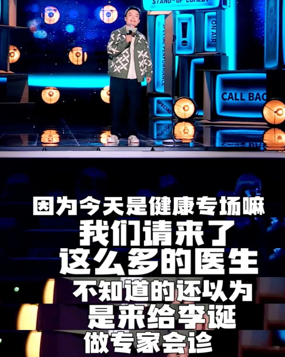到了第八期,笑果的另一位领导程璐终于上台表演了。此前只要是提到李诞或者公司里离婚的事情,他就总能躺枪。所以这次一上台,先调侃一下李诞。作为健康专场,请了很多医生,以为是给李诞专家会诊。