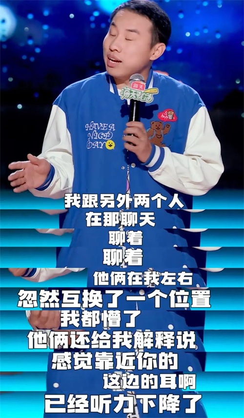 志胜说自己不但爱说话,社交能力强,嗓门也比较大,于是就有以下场景出现,听他讲话的朋友互换了位置,因为靠近他说话的耳朵听力已经下降了。这个包袱之后,志胜就大聊特聊他是如何拍马屁的。所以,整体来说,没有他之前那场的段子好笑。而且这个社牛的状态比当天上场的社恐者鸟鸟来说,还差了些意思。