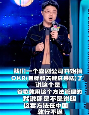 关于绩效,这是很多令职场人头疼的话题。而现在又从KPI发展到了OKR机制。呼兰用小品里“卖轮椅给范伟的桥段”和自己“每天写一个段子就能得冠军”这两个角度很形象地诠释和讽刺了OKR机制的本质。这种表现方式也能看出一个脱口秀演员的创作能力。