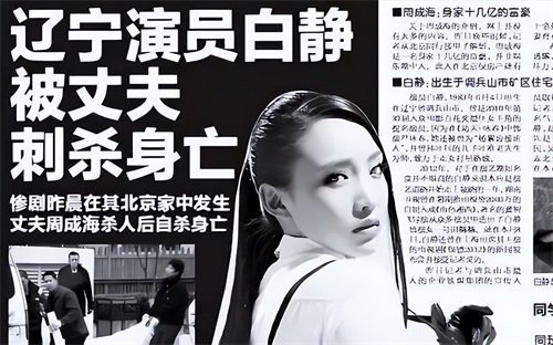 2012年2月29日,一则“辽宁演员白静被丈夫周成海刺杀身亡”的消息轰炸娱乐圈。
