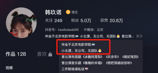 在短视频平台的主页介绍上,演员韩玖诺也注明了: