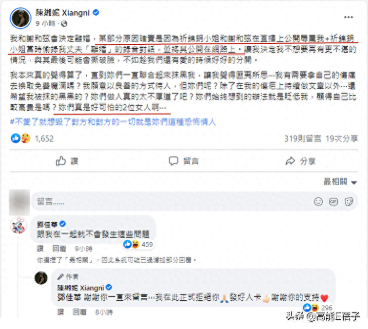 去年11月,莉娅被迫公开道歉。她在社交平台上发声:“很抱歉,我侵害了妳的配偶权,我抢了妳的老公!由我扛起责任来画下句点,于是有了今天的发文叫做如妳们所愿”。