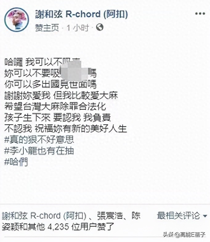 不过他和Keanna也彻底缘尽,Keanna曾晒了张怀孕6周零3天的B超图,谢和弘直接喊话:“ 谢谢你爱我,但我比较爱大麻。”