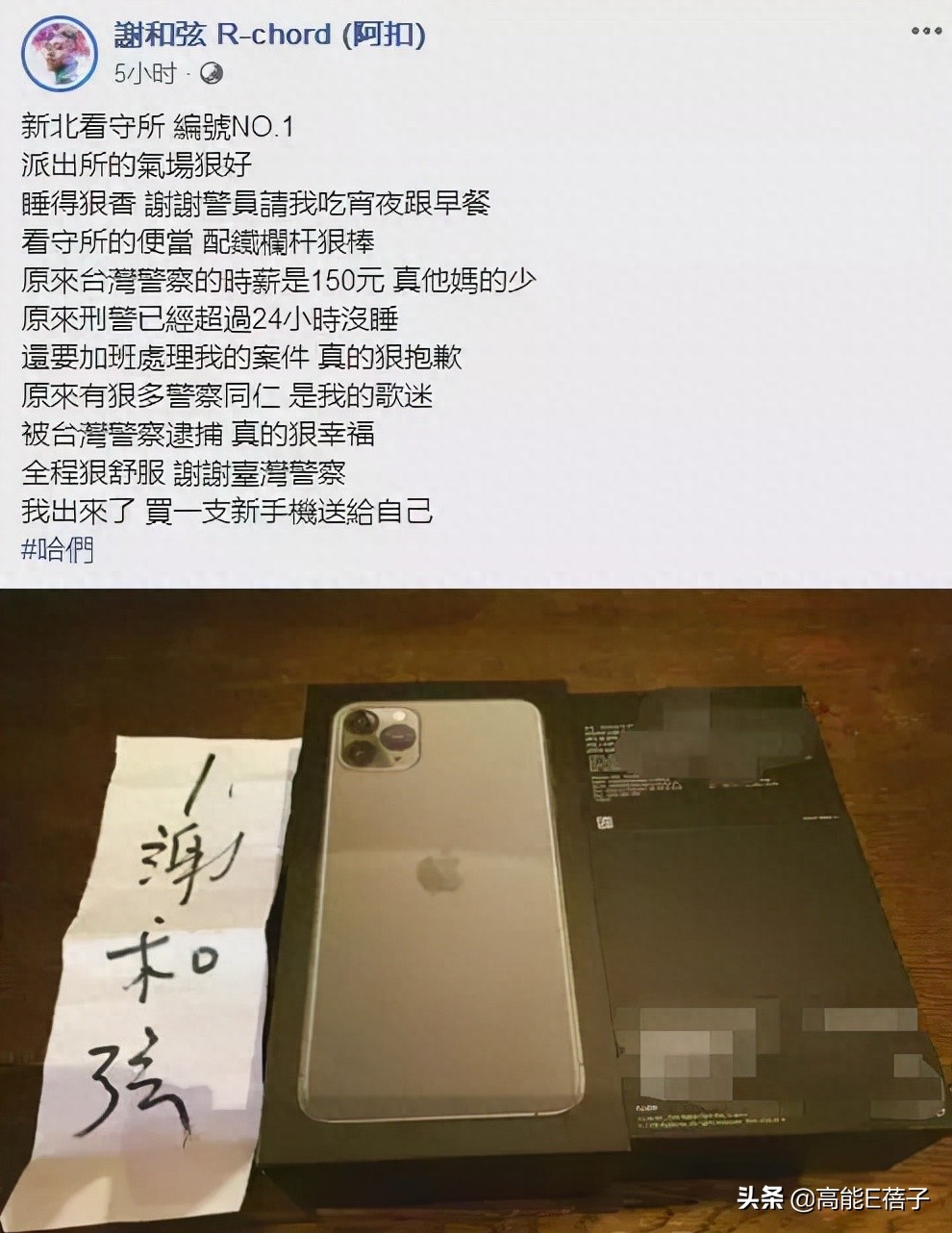 回家后的谢和弦十分嚣张,不仅在社交平台分享被抓感受,感叹对方薪水太低,还大言不惭地说,很多警察都是他的歌迷,被对方逮捕很幸福,谢谢他们。