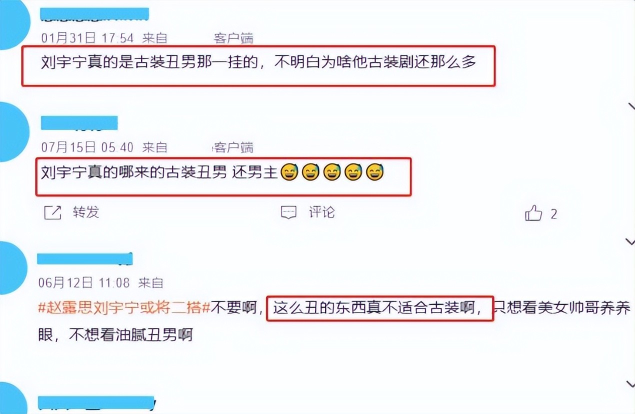 对刘宇宁最不友好的其实是他并不适合古装剧,妆容和服装都不适合他的气质,但他偏偏接了很多古装剧,让很多网友吐槽他的古装剧真的丑。