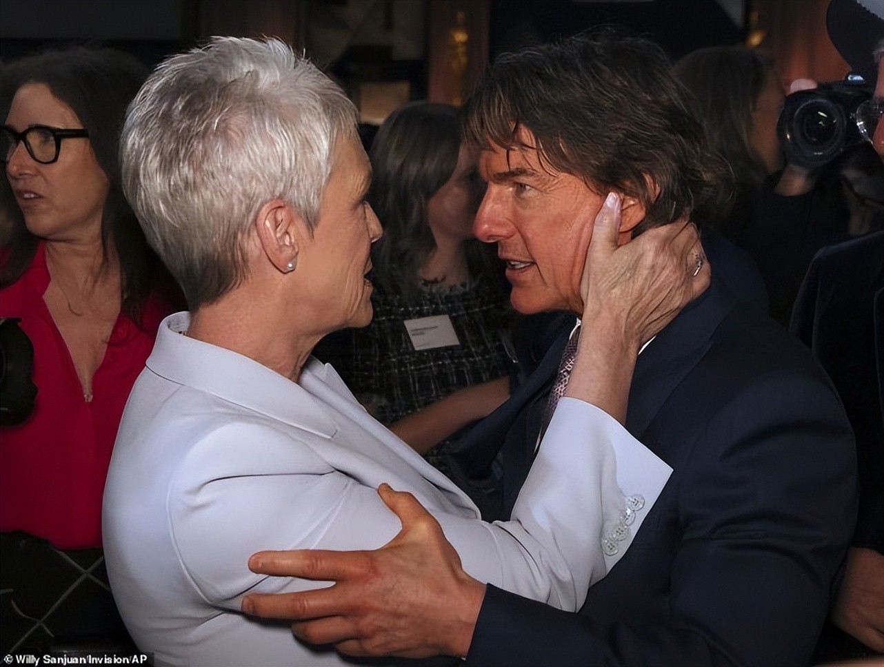 和杨紫琼一起出演《瞬息全宇宙》,并因此获得奥斯卡最佳女配角提名的美国老牌女星杰米·李·柯蒂斯,见到阿汤哥时显得很是激动,狠狠地捧起了他的脸。