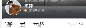 相比之下,他的对象陈律,算是大网红了,抖音坐拥 400 多万粉丝,成名也比较早。