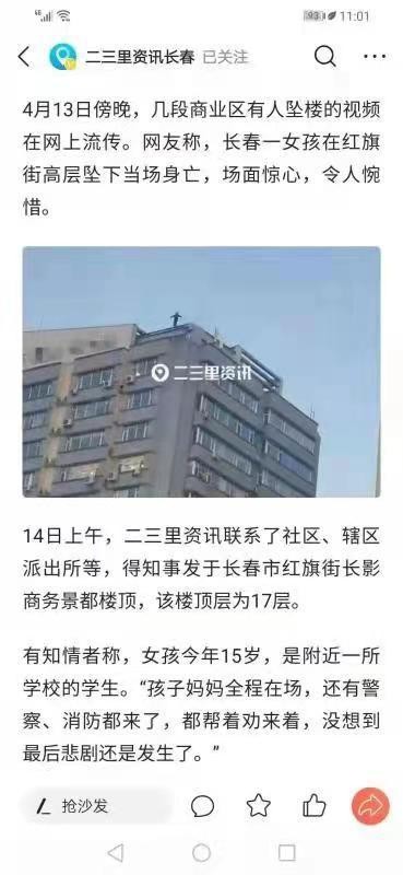 长春 红旗街15岁女学生跳楼轻生的消息