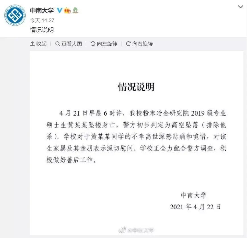 4月21日早晨6时许,我校粉末冶金研究院2019级专业硕士生黄某某坠楼身亡,警方初步判定为高空坠落(排除他杀)。学校对于黄某某同学的不幸离世深感悲痛和惋惜,对该生家属及其亲朋表示深切慰问。学校正全力配合警方调查,积极做好善后工作。